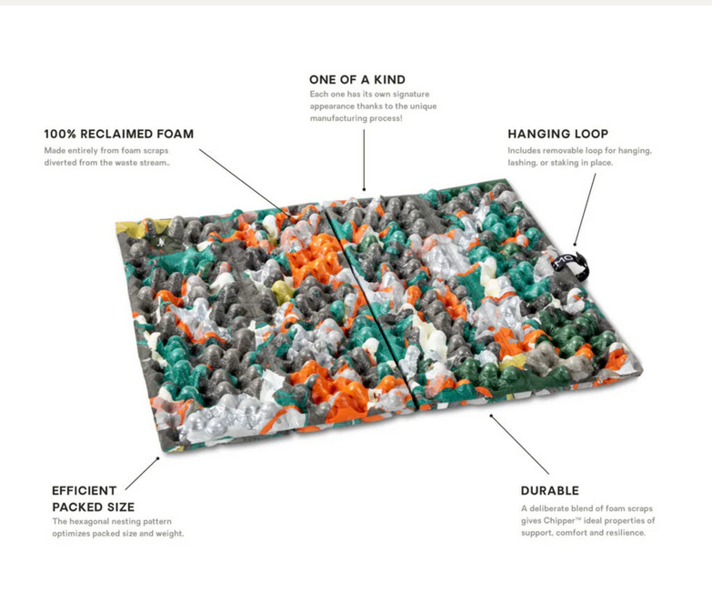 By reclaiming foam remnants from our pad manufacturing, in the first year of production we are able to keep 8.8 tons of scrap foam out of the waste stream and 48 tons of carbon dioxide out of the air compared to using virgin materials. We picked just the right blend of reclaimed scraps to give Chipper excellent support and resilience. And utilizing the hexagonal nesting pattern from our Switchback™ pad, we were able to optimize for packed size and weight.